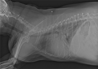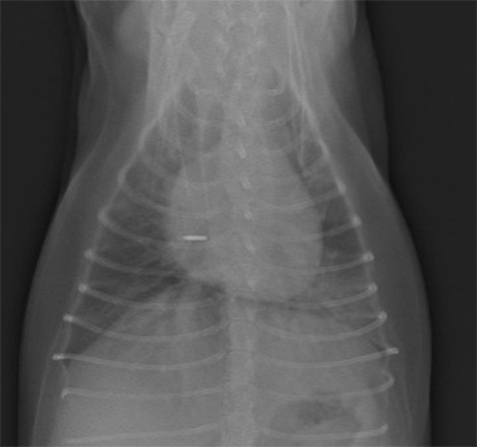 - 胸部X線検査にて、心陰影の拡大および左肺後葉領域の不透過性亢進像が認められた。